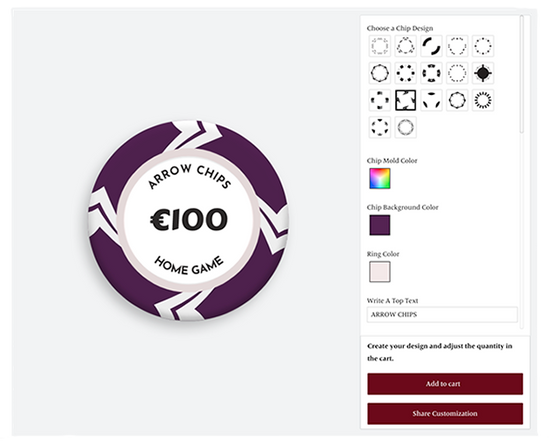 At Poker Merchant you are able to create your Poker Brand yourself creating Custom Poker Chips, Custom Poker Plaques, Custom Playing Cards and Custom Poker Tables using the most advanced online tool of the world.
