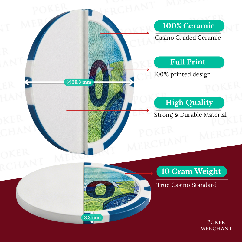Notre Set de Jeton Poker Euro Chips est un set de Jeton Poker fréquemment acheté. Fabriqués en matériau Ceramic, ces Jeton Poker présentent une qualité supérieure et un design créé à l'aide d'une méthode d'impression complète. Chaque jeton de poker a des bords parfaitement alignés pour compléter le design. Avec sa haute qualité et son look unique, ce set de Jeton Poker est une option idéale pour les amateurs de poker qui cherchent à améliorer leurs parties de poker à domicile.L'Jeton Poker est conçu pour les joueurs de poker qui ont besoin des Jeton Poker sans la Malette de Poker, mais il est toujours possible d'ajouter une Malette de Poker si désiré en personnalisant la configuration.