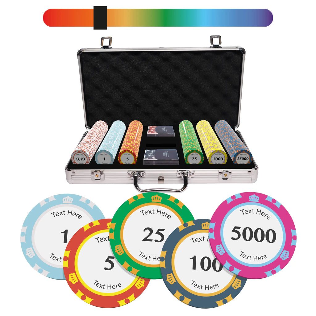 Create your own custom poker set featuring 300 high-quality ceramic chips. Upload your logo, artwork, or text and specify the quantity for each chip design (up to 300 chips in total). Choose your preferred chip values and edge styles, and customize every detail with ease.