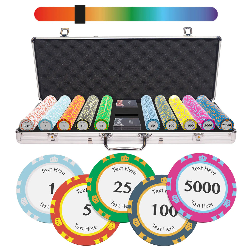 Create your own custom poker set featuring 500 high-quality ceramic chips. Upload your logo, artwork, or text and specify the quantity for each chip design (up to 500 chips in total). Choose your preferred chip values and edge styles, and customize every detail with ease.