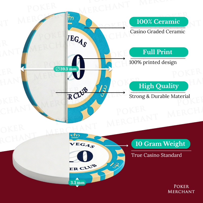 Our Ceramic Las Vegas Poker Chips are a popular choice in our collection. Crafted from Ceramic material, these Poker Chips feature a superior quality and design created using a complete print method. Every Poker Chip has perfectly aligned edges to complement the design. With its high-quality and unique look, this Poker Chips is an ideal option for poker lovers who are looking for durable Poker Chips known for its strength and durability that will last for many years. The Poker Chip Set is designed for poker players who need the Poker Chips without the Case, but it is still possible to add a Case if desired by customizing the configuration.