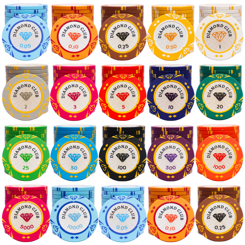 Our Diamond Club Poker Chips are frequently used Poker Chips all over the world. Crafted from Clay Composite material, these Poker Chips feature a beautiful design created using a sticker printing method. Every Poker Chip has perfectly aligned edges to complement the design. With its high-quality and unique look, this Poker Chips is an ideal option for poker lovers looking to upgrade their home poker games. The Poker Chip Set is designed for poker players who need the Poker Chips without the Case, but it is still possible to add a Case if desired by customizing the configuration.