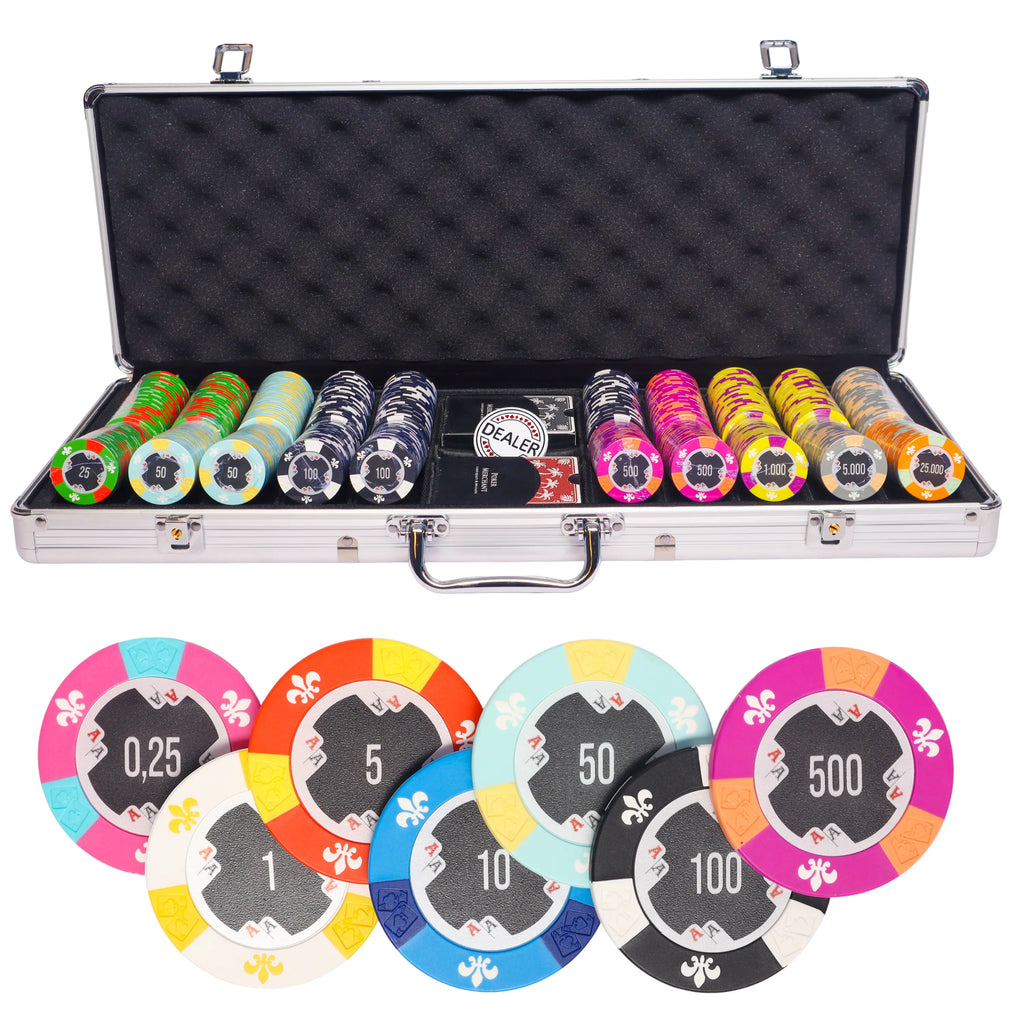 Introducing the Aces Chip Set Cash Game 500, the ultimate choice for your poker nights! Crafted from a high-quality clay composite material, these chips combine durability with a touch of elegance.