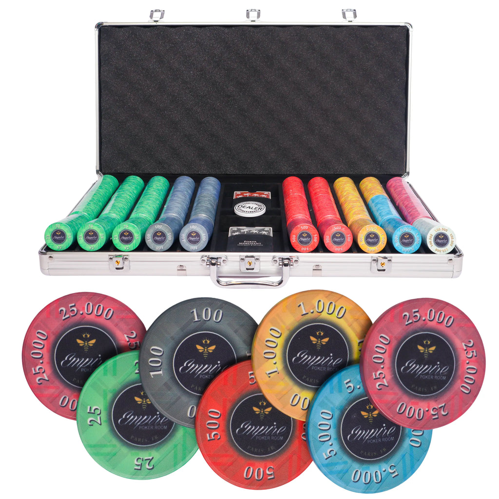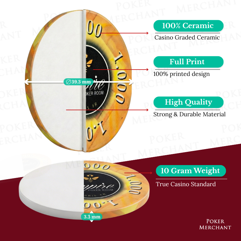The Empire is one of the most prestigious Poker Sets in our assortment. The chips made of Ceramic material and are often used in tournaments. The Empire have a premium design and are made with a complete print method. The Poker Chips have aligned edges to match the outstanding design of the Poker Chips.