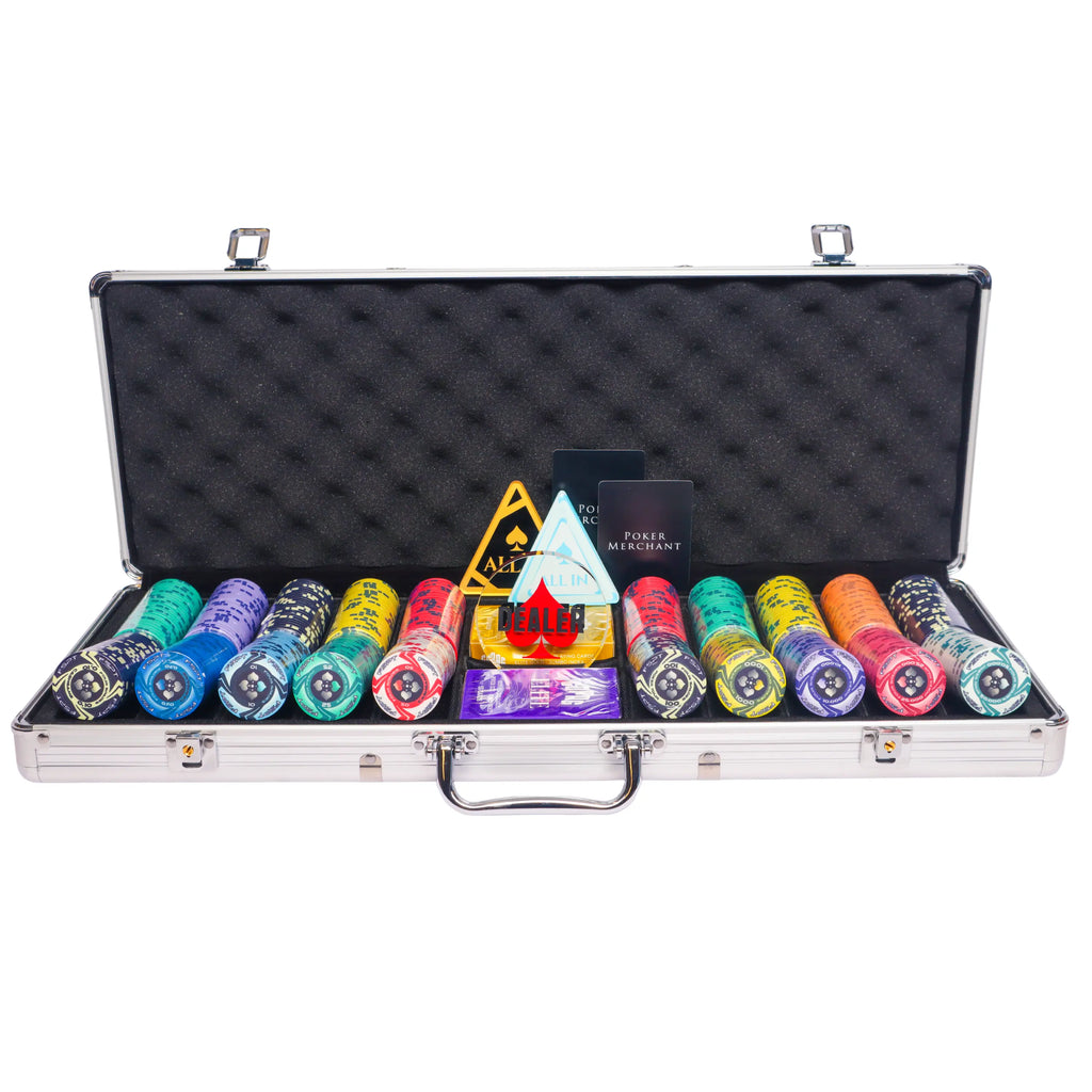 The Poker Set Fspt Tournament 500 comes with a Silver Aluminium Poker Case, a Dealer Button, 2 decks of Poker Cards, and 2 keys to lock the case. Using the configuration tool, additional items can be added or the Poker Case and the Poker Chip distribution can be adjusted.