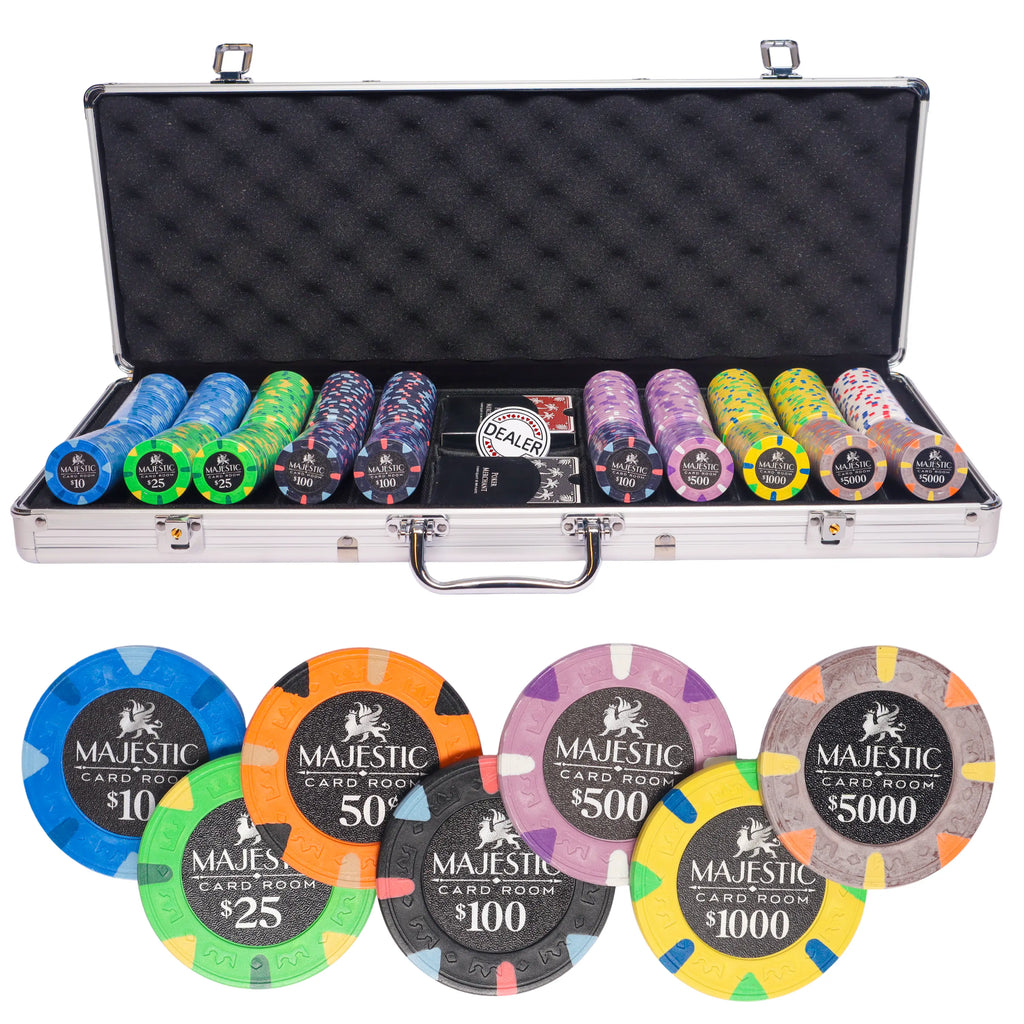 The Majestic is a premium Poker Set that is built to last, thanks to the durability of the Poker Chips and Case. The prestigious Majestic Poker Chips will certainly make an impression at any Poker Table, and other players will be eager to play with your set. Create unforgettable moments and a lifetime of fun by ordering your Poker Set Majestic 500 today.