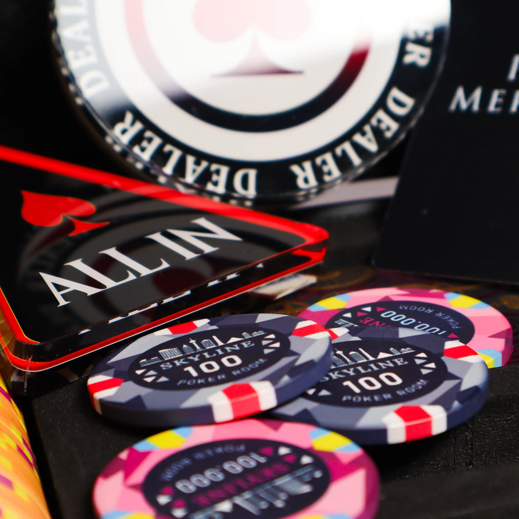 The Poker Set Skyline Cash Game 300 comes with a Silver Aluminium Poker Case, a Dealer Button, 2 decks of Poker Cards, and 2 keys to lock the case. Using the configuration tool, additional items can be added or the Poker Case and the Poker Chip distribution can be adjusted.