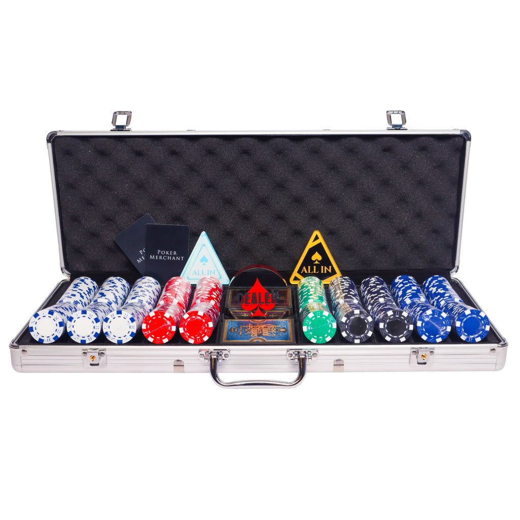 The Poker Set The Dice 500 comes with a Silver Aluminium Poker Case, a Dealer Button, 2 decks of Poker Cards, and 2 keys to lock the case. Using the configuration tool, additional items can be added or the Poker Case and the Poker Chip distribution can be adjusted.